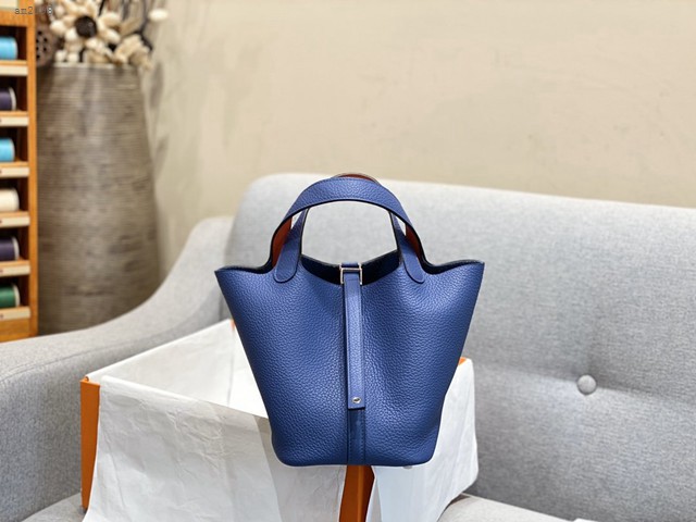 Hermes女包 愛馬仕Picotin lock菜籃子包 明藍拼火焰紅 手縫臘線 Hermes手提女包  am2098