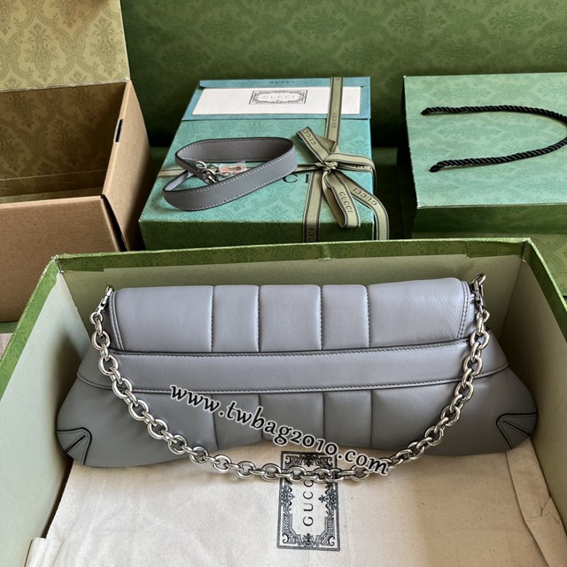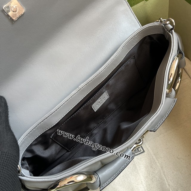 Gucci Horsebit Chain中號肩背包,Gucci煥新演繹品牌經典元素,將典藏設計與時尚創意巧妙糅合,盡展當代美學理念。這款手袋匠心綴飾2000年代初風靡一時的馬銜扣設計,傳承品牌經典。這款手袋在2023秋冬系列煥新演繹,運用多種色彩和紋理呈現當代格調。灰色絎縫皮革,鈀金配件,作為附帶Gucci Tag的精選單品,本商品支持NFC技術,助您驗證真偽,享受數位化的創新體驗。馬銜扣,內部:一個卡片隔層和口袋,可拆卸皮革包帶(21釐米高)可拆卸鏈式肩帶(20.5釐米高)磁力按扣,重量:約0.7千克。型號:764255。尺寸:38(寬)x 15(高)x 16cm(深)顏色:灰色/原廠皮。義大利創作