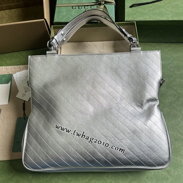 Gucci Blondie系列中號托特包。Gucci Blondie系列包袋匠心綴飾以品牌典藏符號元素為靈感打造的圓形互扣式雙G元素。這款Gucci Blondie系列托特包配有頂部提手和鏈式肩帶,包身醒目綴飾以皮革貼飾匠心打造的品牌標識。銀色皮革,棉麻襯裏,圓形互扣式雙G皮革貼飾,內部:3個主隔層和1個拉鏈口袋,頂部提手(20釐米高)鏈式肩帶(42釐米高)。重量:約1.2千克。型號:751516。尺寸:34.5(長)x 41(寬)x 8cm(厚)顏色:銀色/原廠皮。義大利創作